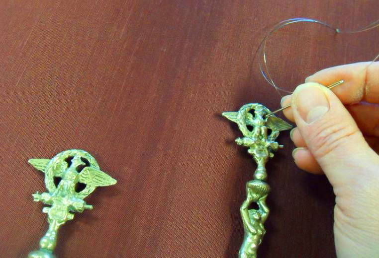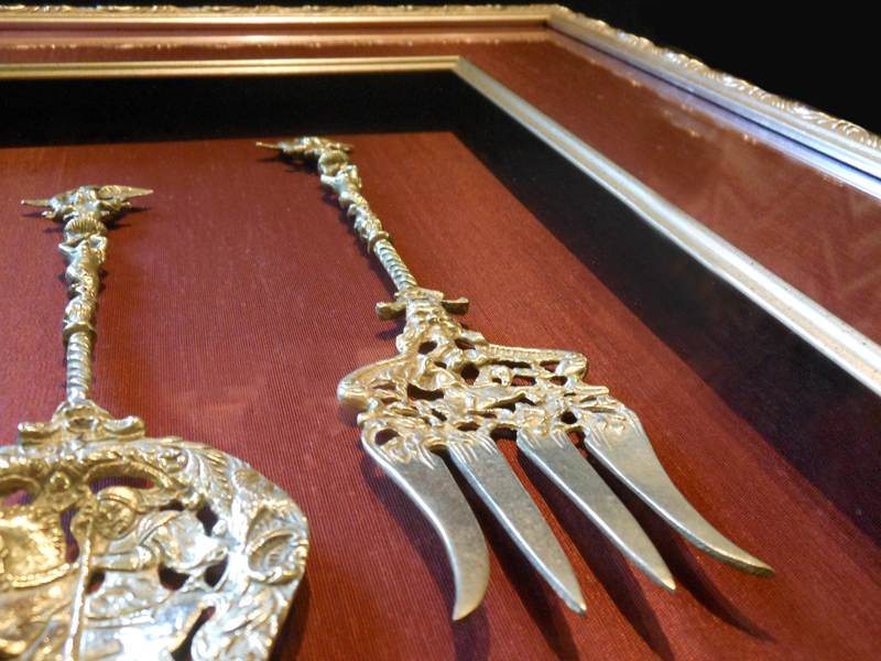 Heirloom pieces don't need to stay wrapped up in a drawer - enjoy these works of art. An heirloom silver cake serving set lies in a shadow box on a burgundy silk mat with a silver fillet edging the matching top silk mat. A decorative warm silver frame echoes the design in the pieces.