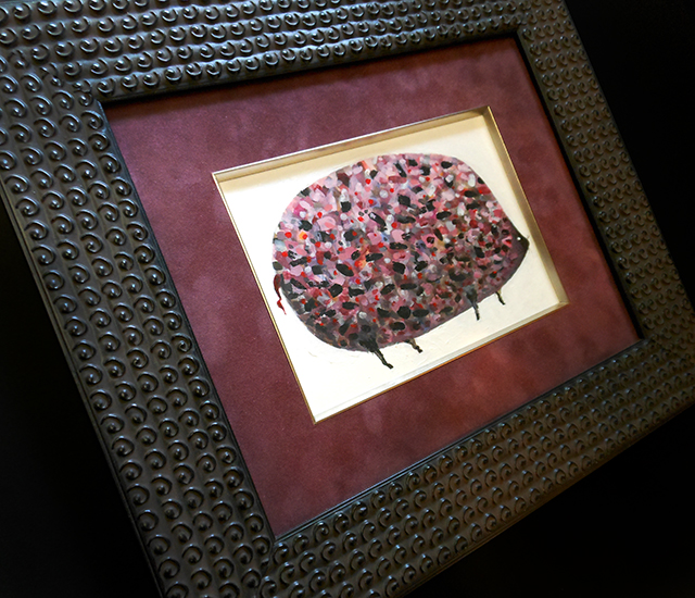 A fun piece calls for a fun frame! Here, a Bordeaux colored suede mat and curlicue patterned textured frame complement the tail of the 'Beastie'.